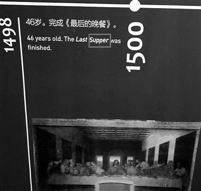 关于达·芬奇46岁的经历,展览介绍说:“46岁。完成《最后的晚餐》”,其对应的英文翻译是“46 years old. The Last super was finished.”而super一词在英文中的意思是“超级的”,“晚餐”的英文词汇实为supper,该翻译中少了一个字母“p”。