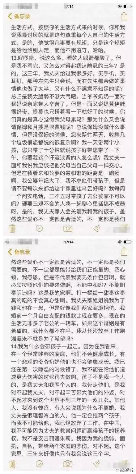这位母亲生前在朋友圈里发出了遗书,让她走上绝路的,都是我们熟悉的原因:夫妻三观不合、老公出轨、家暴、产后抑郁、公婆不体谅。