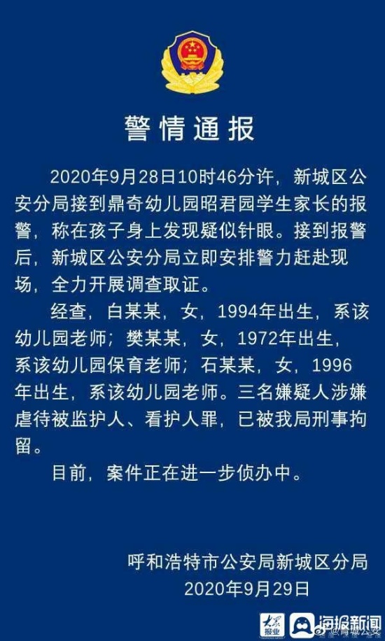 9月28日13时08分,呼和浩特市公安局发布警情通报称,2020年9月28日10时46分许,新城区公安分局接到鼎奇幼儿园昭君园学生家长的报警,称在孩子身上发现疑似针眼。接到报警后,新城区公安分局立即安排警力赶赴现场,全力开展调查取证。