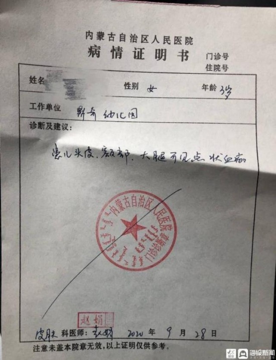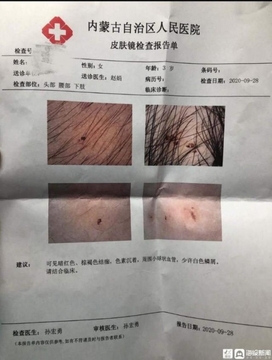“我孩子身上有13处针眼,头上最多,有六七处,还有就是腰上、屁股上、腿上、胳膊上也有。”其中一名孩子的家长杨先生告诉大众网·海报新闻记者。根据杨先生提供的内蒙古自治区人民医院“病情证明书”显示,“患儿头皮、额部、大腿可见点状血痂”;另一份“皮肤镜检查报告单”显示,检查部位为“头部、腰部、下肢”,“可见暗红色、棕褐色结痂,色素沉着,周围小球状血管,少许白色鳞屑”。