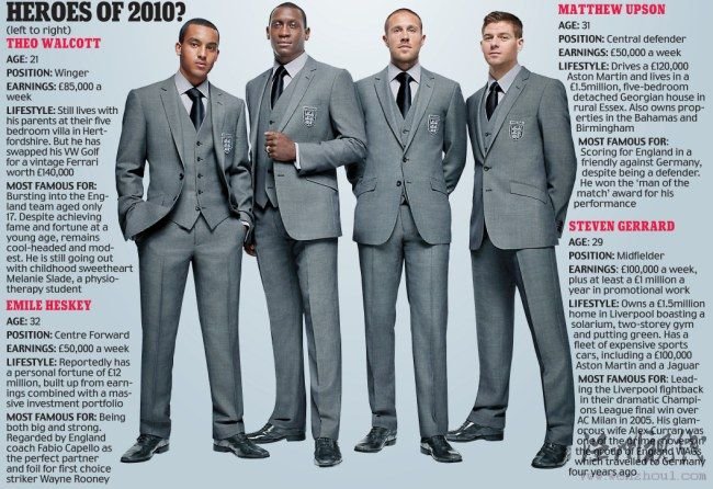 现在国脚们所穿的这身西装也正是英格兰球员们将要在南非穿的。球迷们同样可以在商店买到这身西装,价格还是不是很贵,官方给出的价格是西装120磅、裤子75磅马甲35磅。相信也有不少球迷会去抢购吧。