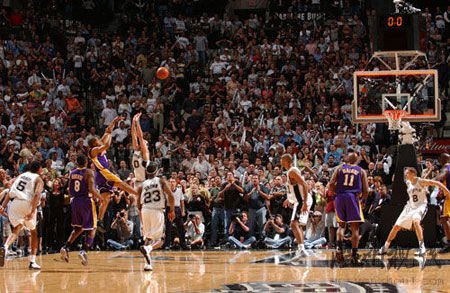 这是湖人队史、季后赛历史,乃至整个NBA历史上最匪夷所思的绝杀没有之一,当时湖人队坐拥四大天王意欲卫冕,拥有巅峰时期GDP组合的圣安东尼奥马刺显然是湖人队最大的敌人,而双方在前四场中战成2-2平。天王山之战,在前三节中,湖人始终占据着绝对优势,但第四节开始后的11投2中很快让湖人陷入了困境,而马刺趁势打出一波18-6的高潮将比分迫近。比赛还剩2分12秒时,帕克抢断科比后的成功上篮将比分改写为71-68之后,整个SBC中心彻底被“BEAT LA”的声浪掀翻了。但是老练的“禅师”马上安排了奥尼尔的内线强打拿到2分,之后,科比的中投又让SBC中心的球迷安静了下来,72-71,湖人再度夺回了领先优势。