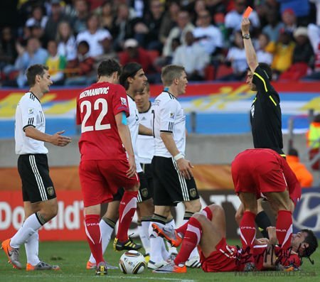 克洛泽的染红下场无疑成为本场比赛最大的转折点,因为就在克洛泽被罚下场不到两分钟后,塞尔维亚便利用一次边路突击由约万诺维奇完成致命一击!第37分钟,克洛泽从身后铲倒了带球反击过程中的斯坦科维奇,马里恩科不加犹豫的出示了第二张黄牌,将克洛泽逐出场,尽管不少德国球员上前质疑这一判罚,但马里恩科对于红牌的判罚没有任何解释。