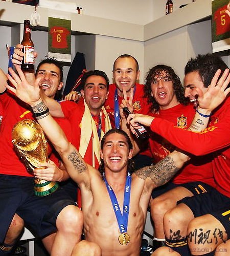 在足球场球场的现场领取大力神杯并绕场庆祝后,西班牙队全体将士回到更衣室开始了又一轮狂欢,那里当时没有摄像机,所以可以更加肆无忌惮。