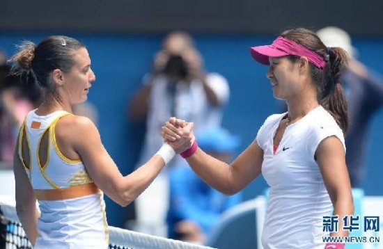 李娜进澳网四强:比赛结束,李娜和佩内塔握手致谢,感谢强大的对手成就强大的李娜。
