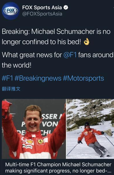 舒马赫苏醒:2018年12月18日,据外国媒体《福克斯体育》报道,因滑雪事故昏迷5年之久的车王舒马赫已经恢复清醒,并且不再卧床不起,也无需通过插管维持生命,但仍需接受护理与治疗,治疗费用预计高达5万英镑/每周。