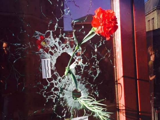法国恐怖袭击现场可以看到酒吧窗户玻璃上有子弹射击留下的弹孔,弹孔里被前来悼念的巴黎市民插入了鲜花。