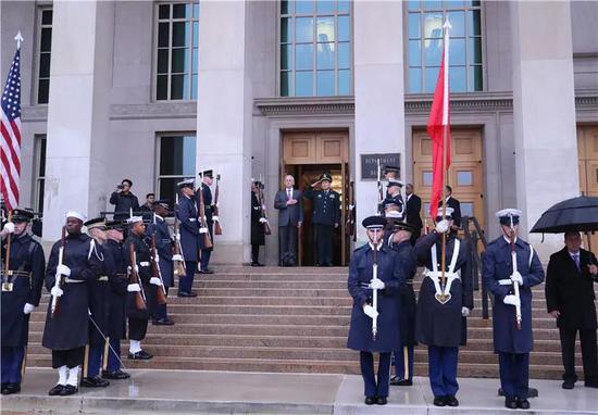 美方无意围堵中国:会谈前,美国国防部长马蒂斯为国务委员兼国防部长魏凤和举行欢迎仪式。李晓伟摄