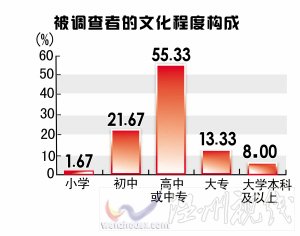 专业运动员的文化程度主要集中在高中(或中专)与初中水平,分别占55.33%和21.67%。大学本科及以上的仅占8%。(见下表)