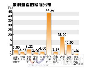 其父母的文化程度同样以这两个领域为主。高中(或中专)所占比例最大,为35.74%,其次为初中文化程度,占30.67%,大学本科占9.1%,研究生以上文化程度的没有。(见下表)
