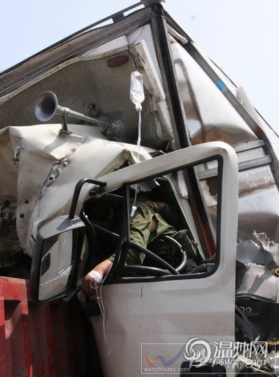 甬台温高速交通事故现场:海鲜车驾驶室里还有4人被困,医务人员给他们挂上盐水