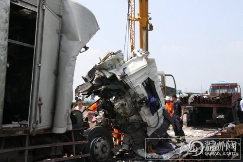 甬台温高速交通事故现场 救援人员对车头进行分解,以便救出驾驶室内的人员