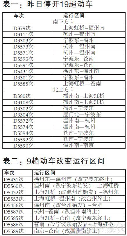 继前天停靠宁波火车东站的15趟动车停开后,截至记者发稿,昨天仍然有19趟动车停运,其中南下方向共10趟,北上方向有9趟。(详见表一)