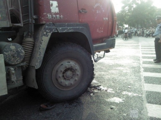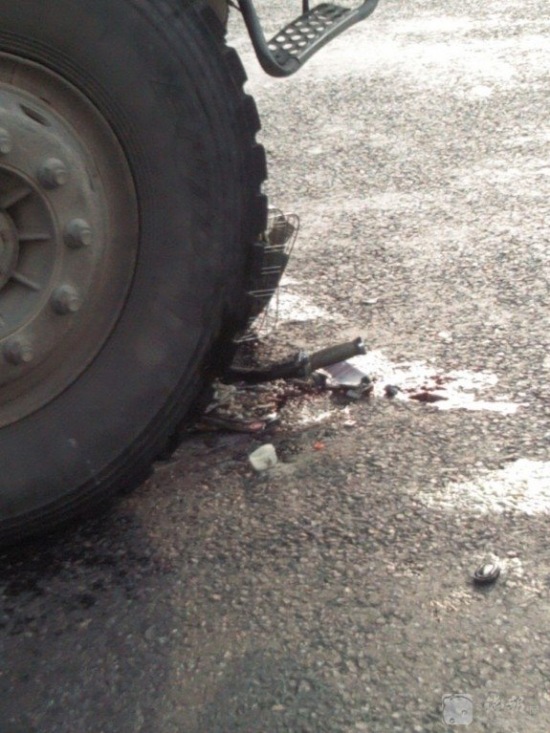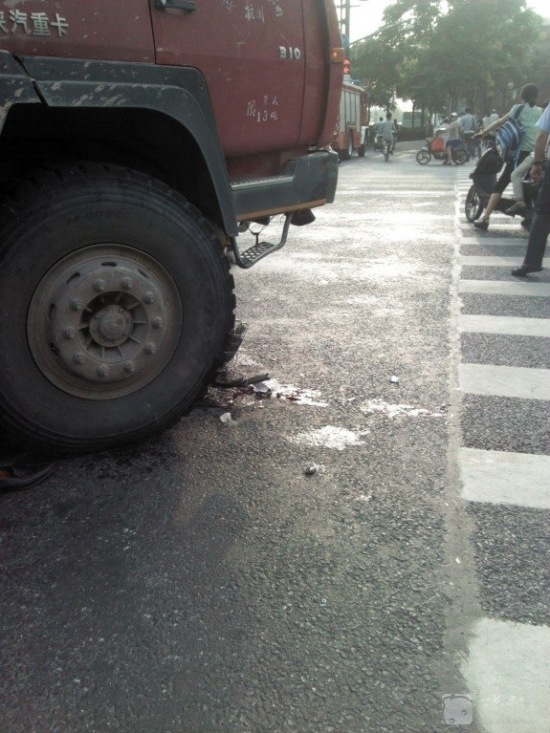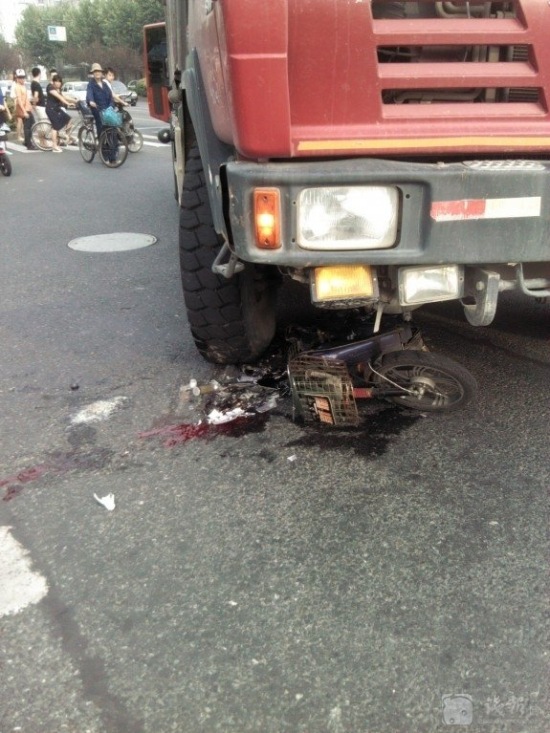 杭州车祸网友报料:2013年9月12日下午4点15分左右,杭州学院路文一路口发生一起大货车撞电瓶车车祸,电瓶车车主受伤已被送医,目前生死未卜。杭州学院路车祸现场,只留下被大货车前轮压碎的电瓶车残骸。