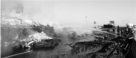 温州视线 3月21日上午,在浙江申嘉湖高速上发生两起事故,先是一辆载布匹的货车自燃起火,随后一辆载有两万瓶红酒的货车在途经事故路段时又发生侧翻,两起事故造成500多万的经济损失。