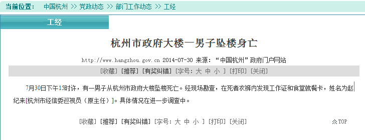 2014年7月30日,杭州有位官员坠楼:今日下午3点左右,浙江省杭州市府办公楼内,一名男子从20层坠楼。警方确认坠楼男子是杭州市经济和信息化委员会巡视员赵纪来。坠楼原因还不清楚,杭州巡视员赵纪来坠楼是跳楼还是自主坠楼?具体情况警方正在调查。