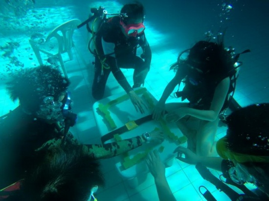 在水下麻将的发起者名叫胡雪娇,是位喜欢潜水的“90后”女孩。当天上午,一帮潜水爱好者讨论活动安排,考虑到操作性和水下拍照美观程度,大家便同意了她的提议,去黄龙体育中心的跳水馆里打回水下麻将。“我们共在水下打了三局,算上每打完一局还要上岸讨论的时间,总共玩了一个多小时。”麻将就是平时用的;桌子是普通塑料小桌,桌脚挂上重物加以固定。和岸上玩不同,水下打麻将因为要穿戴着潜水装备,所以交流只能靠手势,不能像平时一样很爽地喊“和了”。另外,所有动作都得轻拿轻放,不然一不小心带动水流,麻将就有可能移动,甚至倒掉。“不过这可比在岸上打凉爽多了!就是桌子和牌都太小了,下次得换个大点的。”