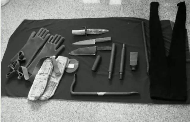 警方赶到时,现场遗留着一副自制消声器、一根自制四节撬棍、一把骨柄匕首和一捆军用背包绳、一副橡胶绝缘手套。