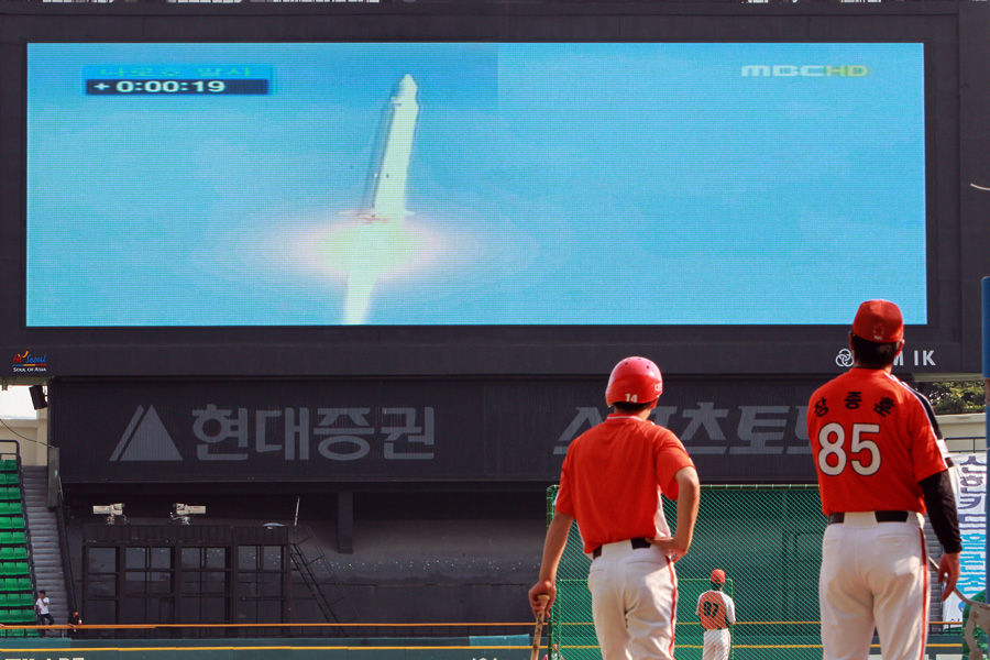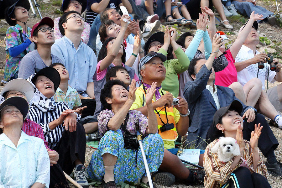 6月10日,韩国民众观看罗老号运载火箭升空。韩国航空宇宙研究院负责人李柱镇10日表示,从安置在“罗老”号内的摄像机获取的画面显示其“突然闪现出火光”,从而推断其内部发生爆炸。