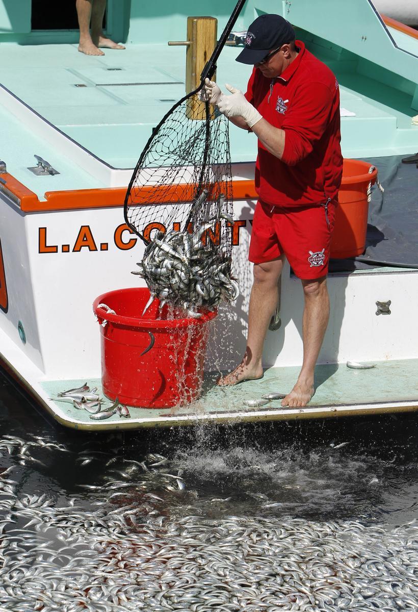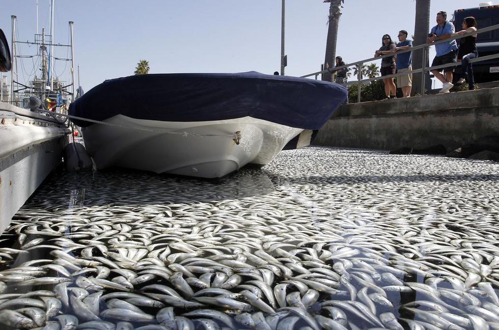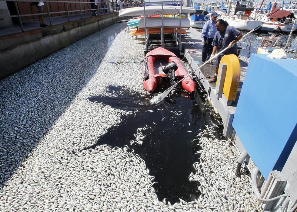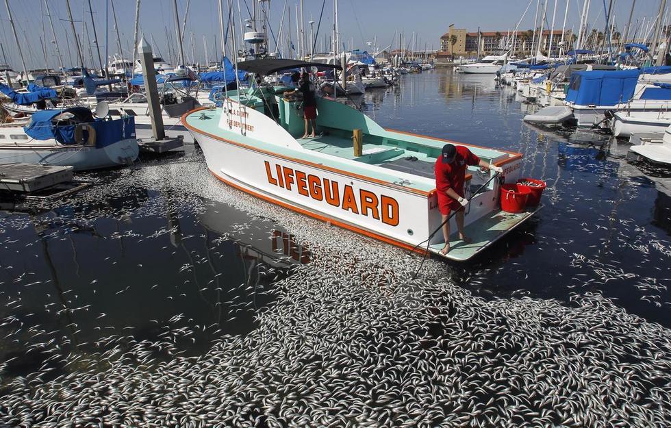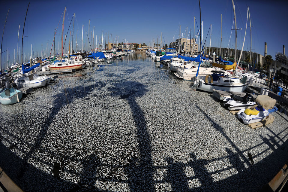美国加州海湾出现数百万条死鱼,引起大面积如此数量死鱼是什么原因引起,暂时没有发现污染源。美国当地时间3月8日,加州洛杉矶以南的海湾区突然出现数百万条死鱼,包括凤尾鱼、鲭鱼、沙丁鱼和其它小鱼。当地一名警方发言人说,死鱼大约有一英尺那么深,国王码头(King Harbor Marina)几十条私人船只周围到处是死鱼。
