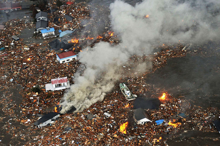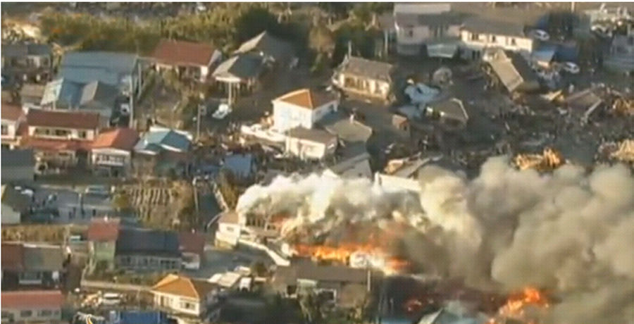 日本地震-引发日本海啸 仙台宫本县已宣布出现“严重伤亡”。3月11日,日本东北部名取,日本地震后的日本海啸淹没了大片房屋。当地多出民居因地震发生火灾。地震造成东京区域405万户家庭停电。
