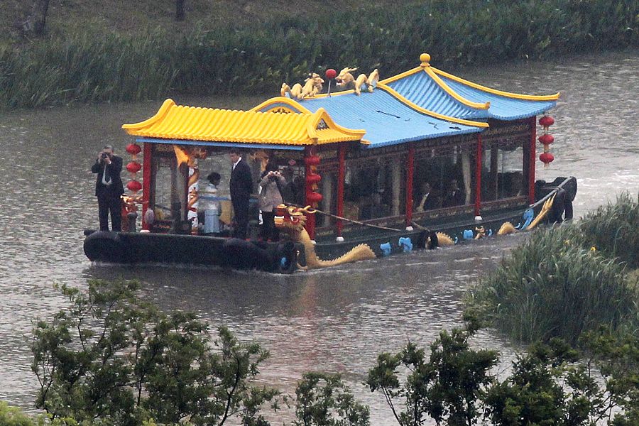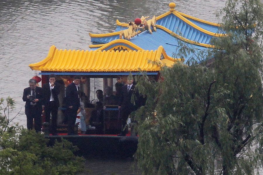 5月23日上午,扬州景区瘦西湖闭园,图为闭园后水中行驶的游船,船上载有多位安保人员。金正日游瘦西湖据外媒日本和韩国媒体报道,5月23日上午,扬州的著名景点瘦西湖停止向游人开放,外界猜测金正日乘坐游游扬州瘦西湖。
