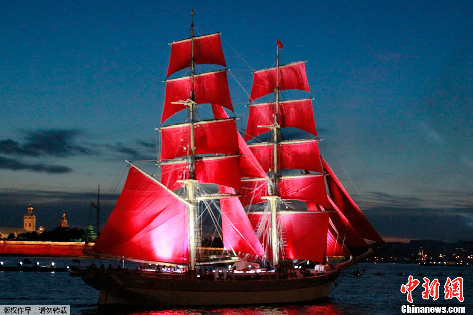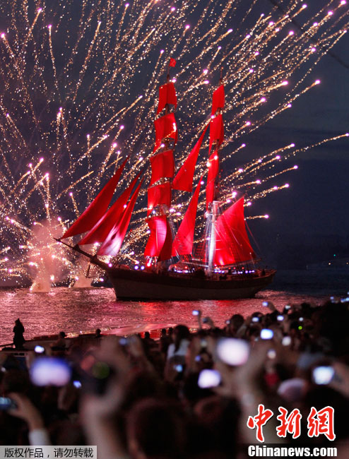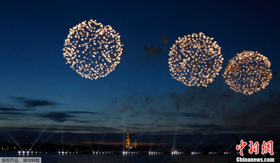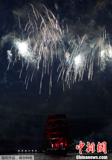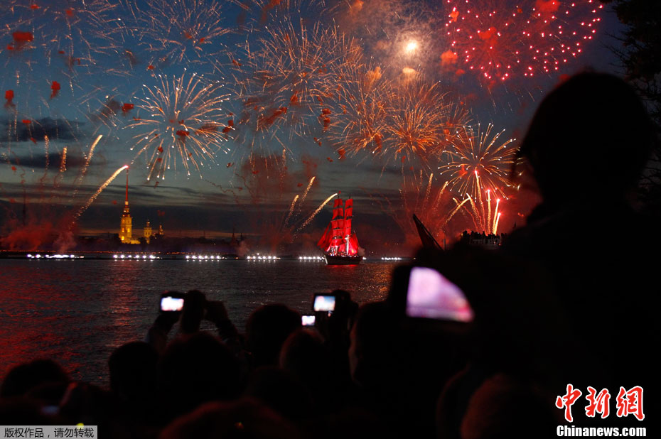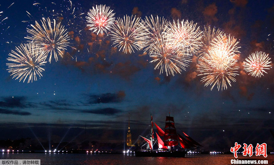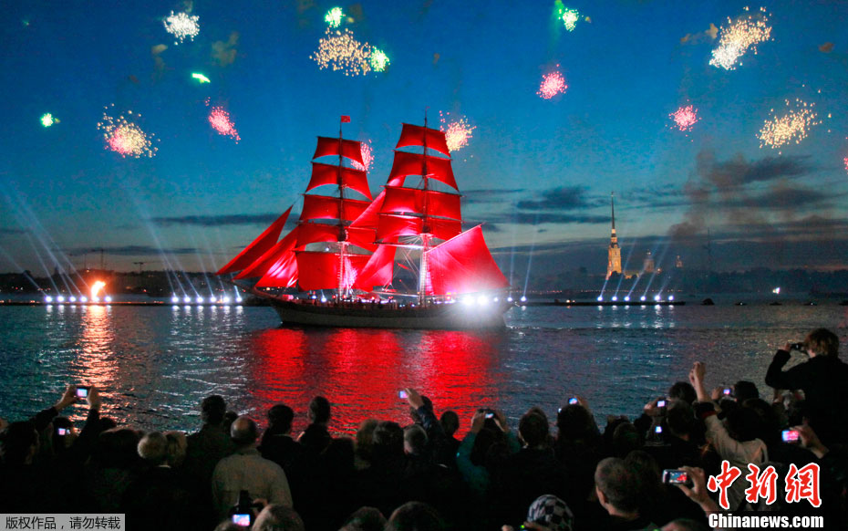 圣彼得堡红帆节烟花灿烂精美图片。2011年6月19日,俄罗斯圣彼得堡涅瓦河畔,人们参加“红帆节”,观看烟花表演。“红帆节”是一年一度的庆祝中学毕业生的节日。每年夏至白昼前最后一个周五的夜晚,圣彼得堡都会举办“红帆节”,俄罗斯红帆节是为了让所有的中学毕业生告别少年,在黎明来临之际迎接人生新的阶段。圣彼得堡红帆节真是浪漫的节日,一个多么朝阳和美好回忆的节日,烟花灿烂,红帆象征着生命旅途一帆风顺,很美,很诗意的节日。
