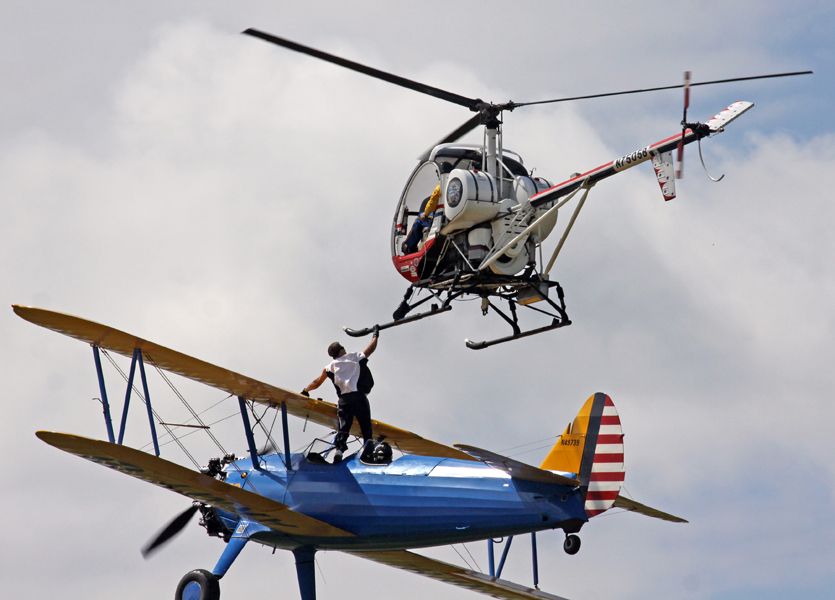 美国特技当场摔死:当地时间8月21日,出身特技世家美国特技演员Todd Green在密西根州的飞行表演时,表演从双翼飞机上爬回直升机,特技演员Todd Green已经从直升机上成功爬到双翼飞机,并且向观众挥手,在飞机上试图行走特技演员失足摔落,当场摔死,将近8万人目睹了这一惨剧,飞机在飞行过程中,特技演员Todd Green在飞机背上受到的空气阻力相当大,稍有不慎失足就很危险,况且特技演员Todd Green可能太自信,没有降落伞,那就是死亡。据悉Todd Green从约200英尺(60.96米)的高度摔下,并且在地上反弹了多次。图为Todd Green从直升机转移上双翼飞机。