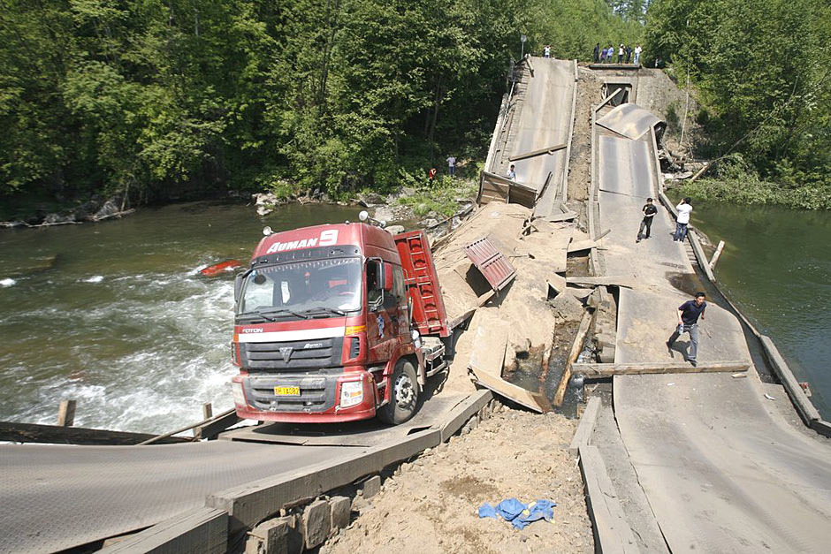 锦江大桥桥体虽然坍塌但桥面的铁板还是一个整体。