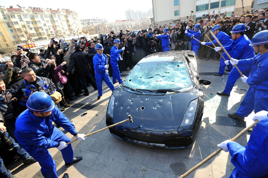 头条 > 图片 > 国内 > 青岛车主怒砸兰博基尼 青岛车主砸兰博基尼300万跑车 时间:2011-03-16 14:22来源:中国日报网 青岛车主怒砸兰博基尼,3.15青岛车主砸兰博基尼300万跑车只因售后服务差。据该兰博基尼青岛车主介绍,2010年11月29日,这辆购入不久的跑车,就在青岛出现了发动机不打火的故障。维修店不但发动机故障没有得到解决,车辆保险杠和底盘也受损断裂。经多次维权仍不能圆满解决,车主决定砸毁这辆兰博基尼。昨日下午3:15,在青岛一灯具城门口,车主雇人将这辆价值300万的兰博基尼盖拉多跑车,砸得面目全非。 原始图片 上一张 下一张 (温州视线)