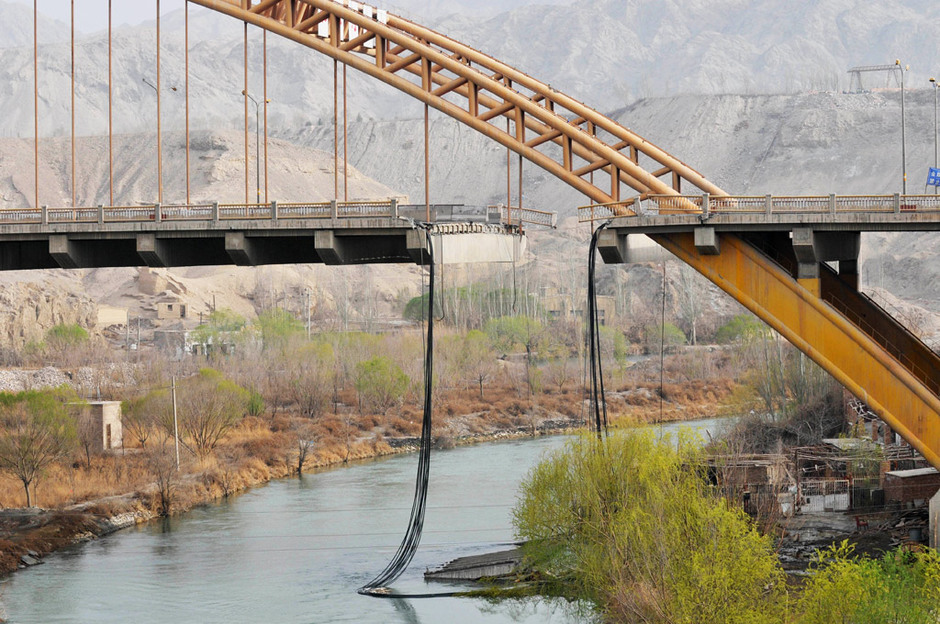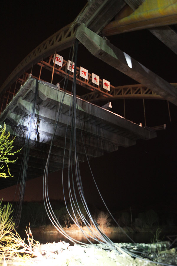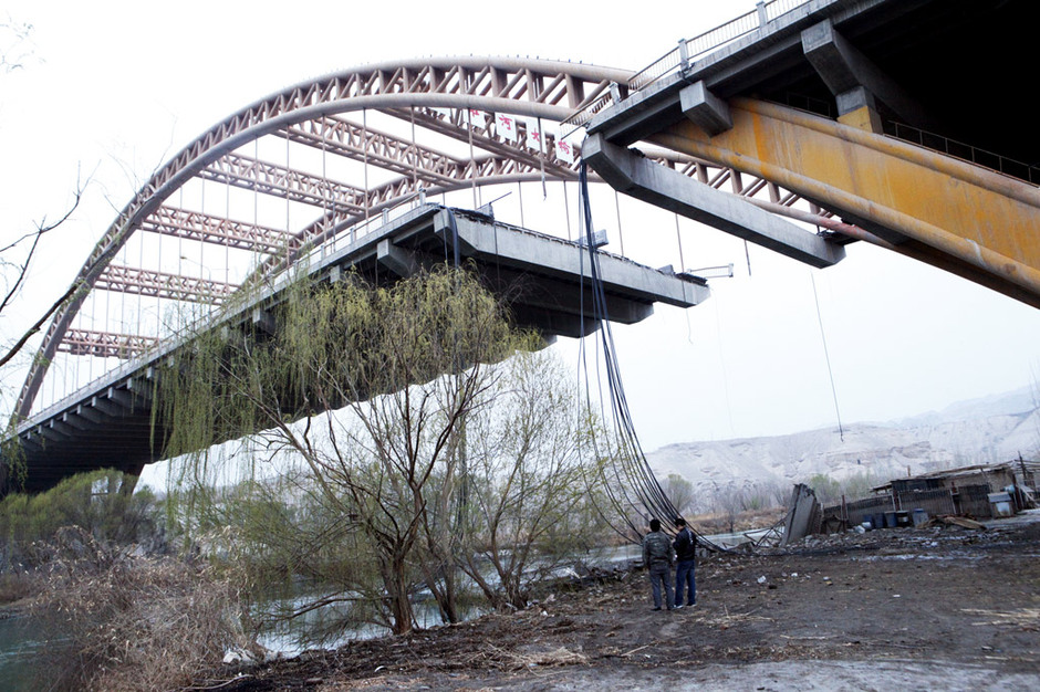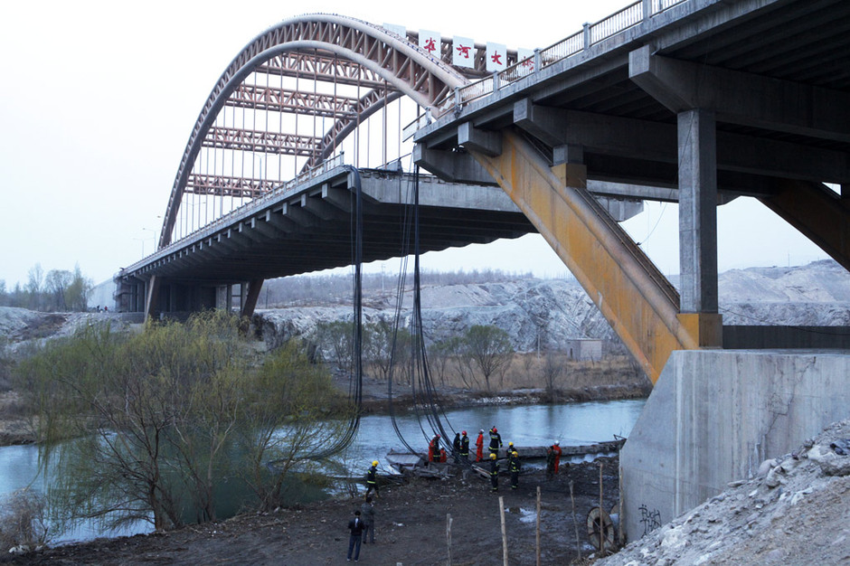4月12日,孔雀河大桥垮塌现场。相关资料:孔雀河横穿库尔勒市区,把库尔勒市分为南北两半,北面以州市地方单位为主,南面以塔里木勘探开发指挥部及石油单位为主。在市区长达七公里的孔雀河上共有五座桥,有孔雀河大桥、狮子桥、建设桥、团结桥等。孔雀河大桥在库尔勒市区的一处重要景观,是孔雀河滨风景旅游带上一道独特风景线。