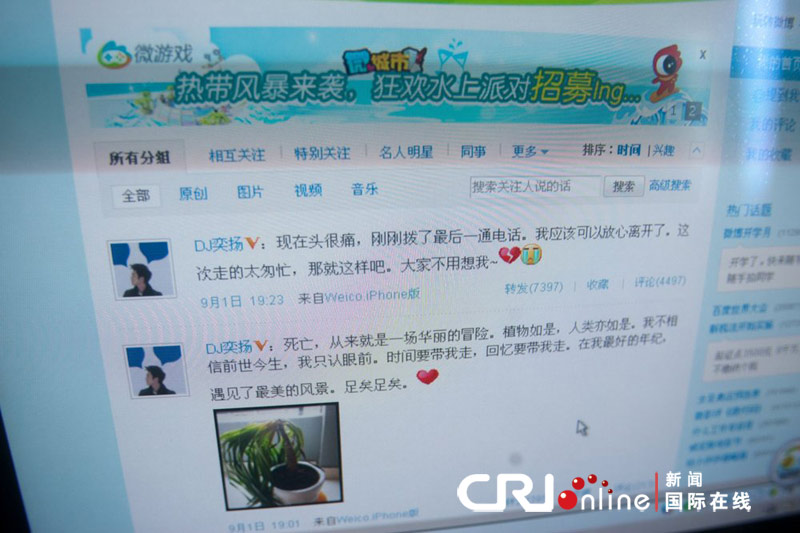 头条 > 图片 > 国内 > 湖北仙桃电台dj奕扬微博直播自杀 dj奕扬自杀 时间:2011-09-03 22:31来源:未知 湖北仙桃电台dj奕扬微博直播自杀,2011年9月1日凌晨,湖北仙桃电台DJ奕扬在微博发布了人生最后一条微博:“现在头很痛,刚刚拨了最后一通电话。我应该可以放心离开了。这次走的太匆忙,那就这样吧。大家不用想我~”,之后dj奕扬服安眠药自杀抢救无效死亡。图为2011年9月2日,仙桃电台DJ奕扬生前所发的最后一条微博,9月2日中午微博已经无法打开。 原始图片 上一张 下一张 (温州视线)