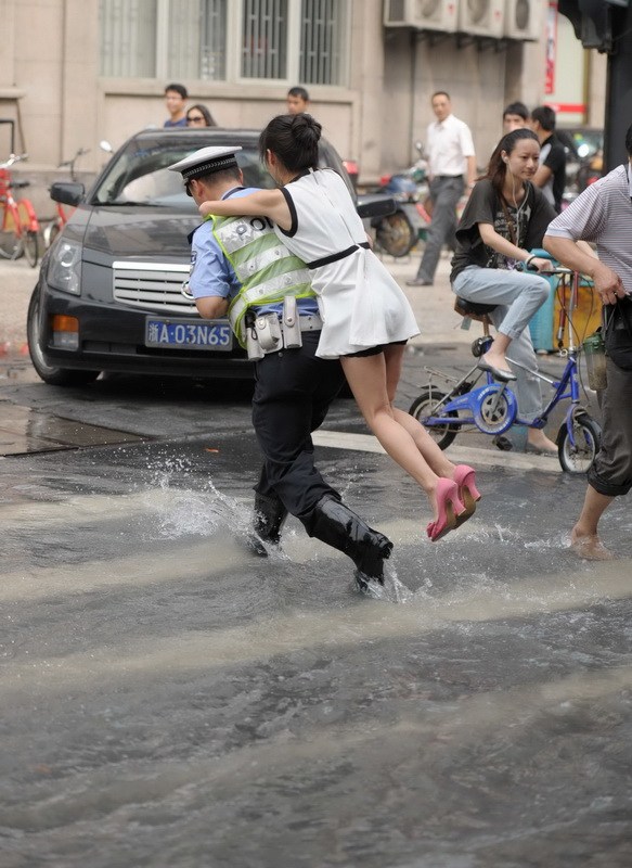 浙江在线消息,昨天上午杭州朝晖路上的一根自来水管爆裂,导致路面被淹,上班族受阻,有一位交警背女孩“过河”,记者找到了背妹子的下城交警大队朝晖中队交警林安敏。当记者拨通林安敏的电话时,他说老婆在微博上看到了他背女孩,回家要搓衣板伺候了。林安敏的老婆不会这么小气吧?就背一个姑娘过马路而已,图片上看到,林安敏的手一直放在自己身前,背上的妹子自己用力趴在林安敏的背上,这也算犯规吗?不算的。林安敏这也要跪搓衣板,网友可不答应。