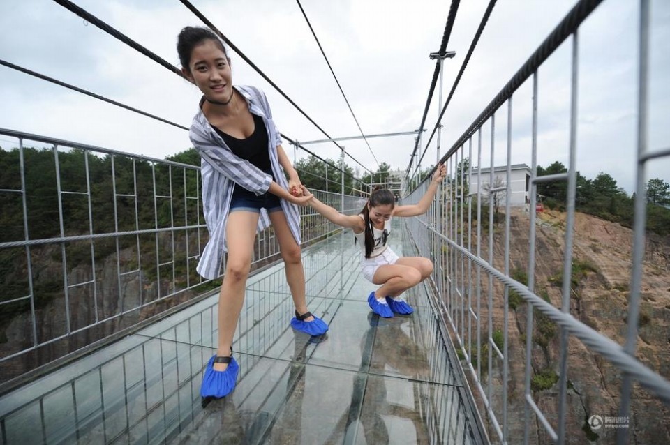 头条 > 图片 > 国内 > 湖南平江县石牛寨玻璃吊桥好吓人 时间:2015-10-06 20:46来源:未知 2015年9月24日,湖南平江县石牛寨玻璃吊桥开通,全长300米、垂直高度180米的全透明高空玻璃吊桥你敢走吗?湖南平江县石牛寨国家地质公园的玻璃吊桥,走上去会摇晃的,很多游客吓得不敢移动脚步。 原始图片 上一张 下一张 (yujeu)
