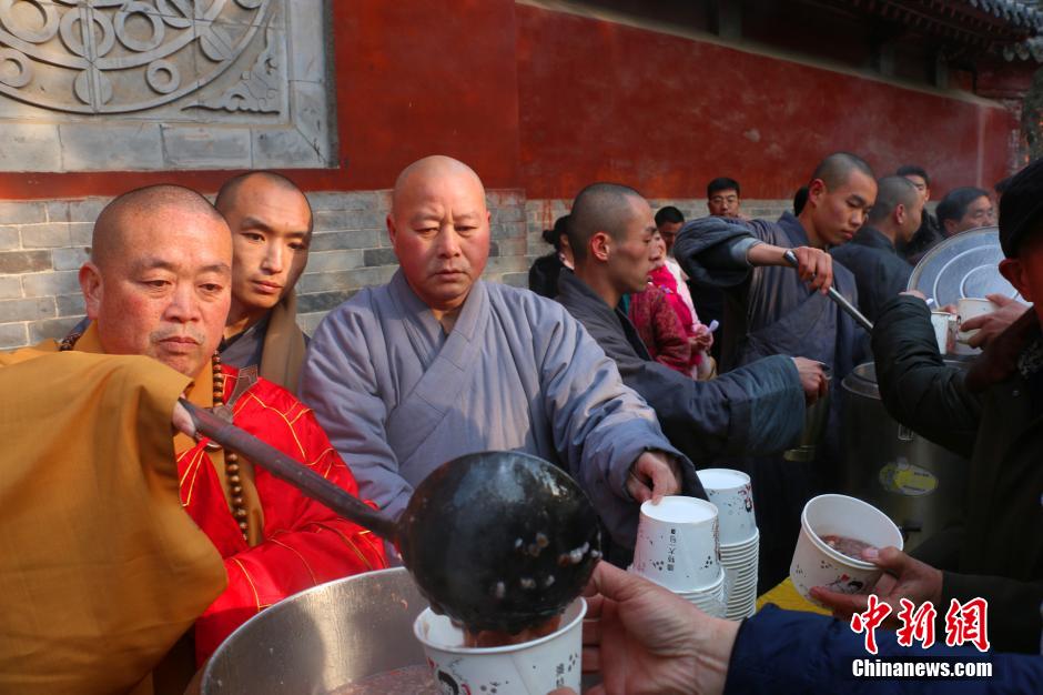 头条 > 图片 > 国内 > 少林寺广施腊八粥现场图片 时间:2016-01-18 13:44来源:未知 2016年1月17日是农历腊八,少林寺广施腊八粥,举行隆重的施粥活动,在少林药局和郑州辖区设10个施粥点。腊八当天共施粥20多万份。少林寺方丈释永信为众开示:腊八节是中国传统节日,也是佛成道日,是佛教最重要的节日,佛弟子称之为“法宝节”。少林寺广施腊八粥,表达了佛弟子对弘扬佛法、接引众生的方便,体现了人们追求智慧、健康、朴素的幸福生活。 原始图片 上一张 下一张 (yujeu)
