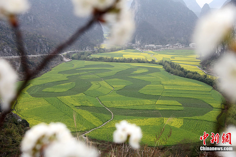 头条 > 图片 > 景点 > 贵州安顺龙宫风景区农民种出风景 油菜花田的巨型“龙”字 时间:2011-03-10 17:06来源:CNSPHOTO 贵州安顺龙宫风景区农民根据“麦田怪圈”的自然风景,设计种出风景,油菜花田的巨型“龙”字。3月8日,在贵州省安顺市龙宫风景区大片金色的油菜花丛中,一个由种植的胡豆和油菜花套种形成的巨大繁体“龙”字清晰可见。近年来,在国家5A级风景区安顺龙宫,当地农民在景区内用油菜和胡豆套种了一个植物汉字“龙”,其造型模仿唐代著名书法家怀素的草书,该字总占地面积约8万余平方米。 原始图片 上一张 下一张 (卢维 摄)