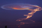 有新疆网友拍到神奇天象,在新疆伊犁新源县吐尔根乡东南偏东方向天空出现不明发光云团,看起来绚丽异常,从网友拍到的不明发光云团的照片看,像不明飞行物的航迹。