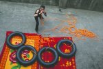 一个鼻孔吹胀轮胎:成都市青白江区同井村的63岁老人聂永兵有绝技,老人能用一个鼻子把汽车轮胎吹鼓起来,而且是4个轮胎同时吹胀,真是民间奇人也。