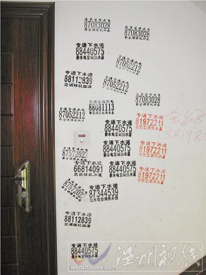 昨天下午,记者来到鄞州区东裕新村实地采访。在79幢88、90、92三个单元的楼道里,记者看到,从1楼至5楼,每层楼居民家门口的白墙上都敲了近20个广告印子,红色的、黑色的、蓝色的,密密麻麻。广告内容有通下水道的、有修热水器的,种类不少。连楼梯台阶和水表箱上也被盖上了“广告印”,让人心生厌恶。