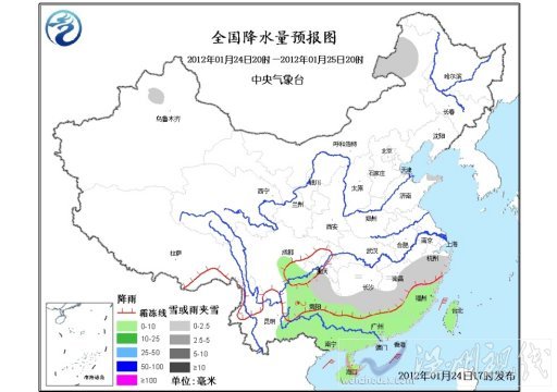 24日20时至25日20时,内蒙古东北部的部分地区、山东半岛东北部、江南南部和东部、贵州北部等地有小雪或雨夹雪,其中,贵州中西部、湖南南部等地的部分地区有冻雨;四川盆地南部、云南东部、华南、台湾等地有小雨或阵雨;台湾海峡有6~7级、阵风8级的东北风。