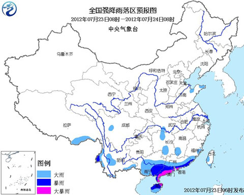 根据7月23日中央气象台发布的最新暴雨天气预报。在23日08时至24日08时,广西大部、福建东部、云南西部和南部、江西南部、湖南南部和北部、山东半岛东部和北部等多个省份将出现大雨或暴雨天气,另外,在广东南部沿海以及海南东北部还将出现大暴雨天气(预计降雨量达100~200毫米)。上述地区在降雨天气的同时还将有短时雷暴大风等强对流天气的出现。