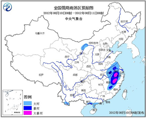 根据气象台预计 在8月10日08时至11日08时,江苏大部、安徽中南部、江西东部、浙江西部、福建西北部、广西南部、广东南部、云南南部以及内蒙古河套地区等地将会出现大到暴雨。另外,在安徽南部、江西东北部、浙江西部等地的局部还将出现大暴雨天气(预计降雨量达100~200毫米);上述部分地区并伴有雷暴大风等强对流天气。