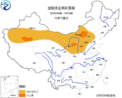 9日08时至9日20时,南疆盆地、甘肃中西部、内蒙古中西部、陕西中北部、宁夏、山西、河北中北部、京津等地有扬沙或浮尘天气,其中,南疆盆地东部、内蒙古中西部局地有沙尘暴。