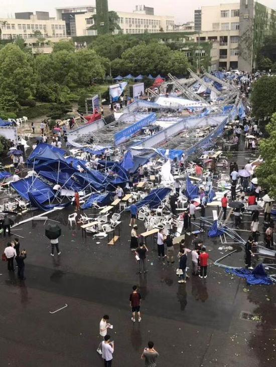一名在温职院参与招聘会的张女士告诉记者,当时风很大把简易棚全部都刮了起来,现场一片混乱,所有在场人员都往教学楼方向跑。“现场受伤的学生和招聘人员很多,后来警车和救护车都来了,拉了好几车到医院。有一个女学生的手臂被简易棚的杆子插了一个小洞,肉都翻出来了,还有些被砸中了头,都是血。”