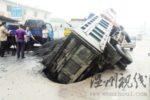 温州网讯 昨天上午,一辆满载煤炭的自卸货车途经永嘉瓯北五星大道时,路面突然发生塌陷,导致货车左后轮掉进大坑,车身向左严重倾斜,煤炭洒落一地,所幸未造成人员伤亡。此前,该路段已发生过2次塌陷事故,有关人士解释,路面塌陷主要与该路段的流沙地质有关。