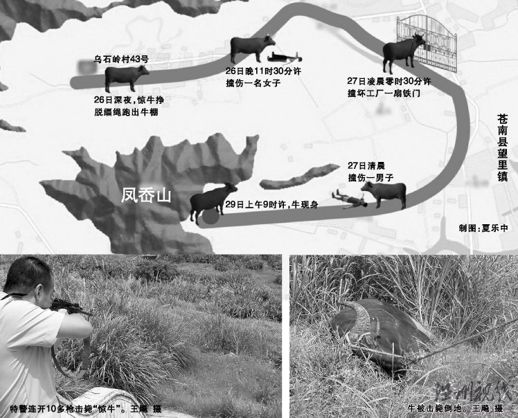 苍南县公安局特巡警大队的特警,闻讯后携带微型冲锋枪赶来。据现场民警介绍,众人先用石头砸向牛,当"惊牛"迎面冲出来时,站在附近高处早已准备好的特警立即开枪,当场击中牛的脑袋,看着还没倒地的牛,特警又连开了10多枪。有经验的村民说:"如果不能把牛彻底击毙,一旦冲出来就非常危险了。"
