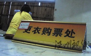"换衣服去隔壁更衣室,每人5块钱。"在寄存处一名工作人员的提醒下,记者在更衣室售票处花了5元,拿到了一张蓝色的小票,凭票进入更衣室换了泳裤。