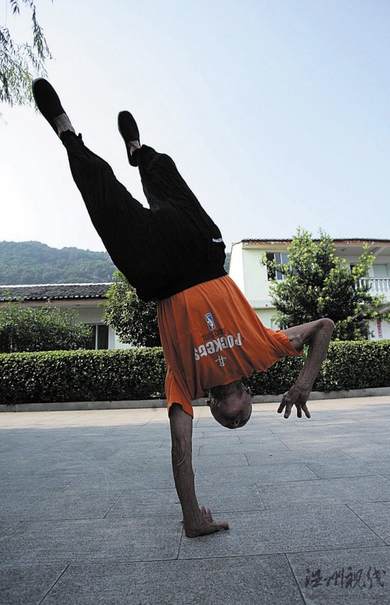 | 乐清83岁老人单手倒立绝活,金玉成13岁那年,在放牛空隙靠着大树练倒立,从此结缘70年天天练功 每天早晚坚持练习。双手倒立可持续两三分钟,单手坚持一分钟央视秀技 年过八旬仍眼不花,耳不背,血糖、血脂、血压都正常 王飚 摄 |