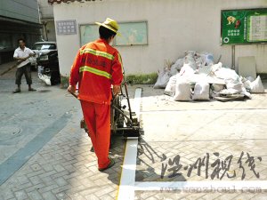 | 交管部门人员在给新的停车位划线。 林明 摄 |