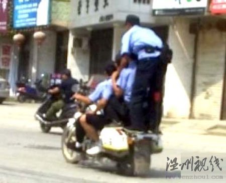 8月10日下午6点15分,一个叫"月乐"的网友在温州网上发了一篇题为《龙湾的4个协警给大家表演摩托车特技,难得一见哦》的帖子,还配有一组4名协警共骑1辆摩托车的照片。"月乐"在帖中说,8月10日上午10点左右,在龙湾往梅头的路上,永强大道那里拍到的!看过摩托车表演杂技的,还真没看过协警也搞这手的……